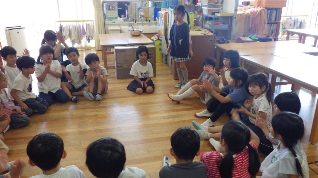 子ども達が大好きなサークルタイムは、クラス集団などで輪になって対話をおこなう活動です。イギリスの小学校など英語圏の初等教育を中心によく用いられる教育方法のひとつで、子どもの主体性や協調性、話す力や聞く力が育まれるものとして紹介され、保育現場でも注目されるようになりました。本園でも3.4.5歳児クラスは時期や年齢に応じながら試行錯誤し取り入れ積み重ねています。今までの経験が糧になる5歳児は、行事前にどんな内容にして楽しみたいかも子ども達の話し合いを通して自分たちで考え決めていきます。