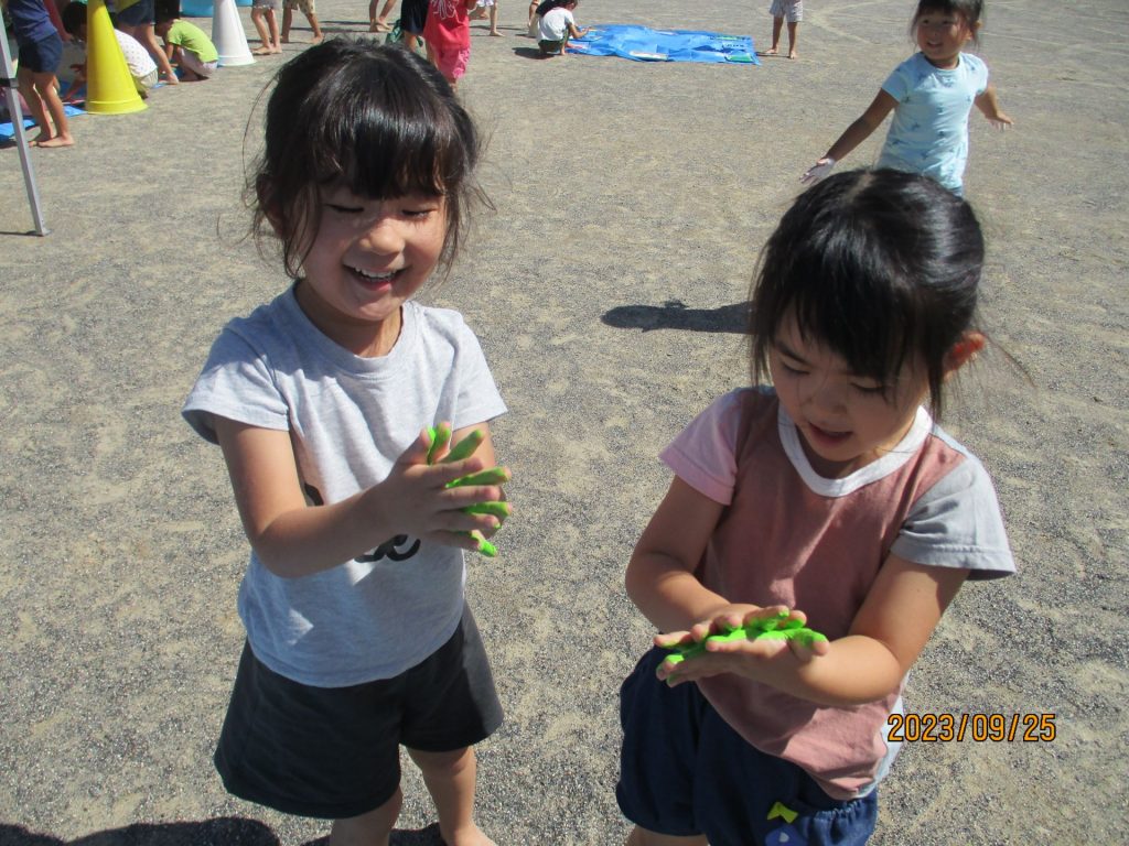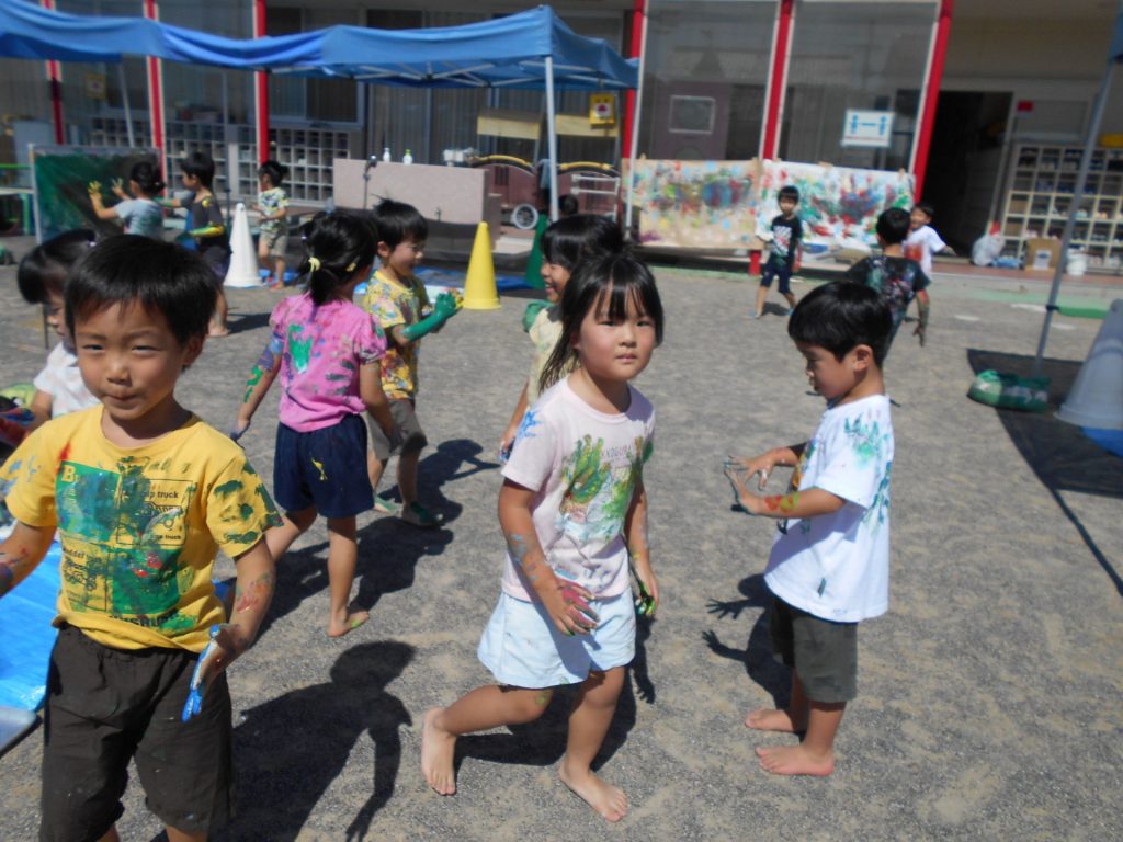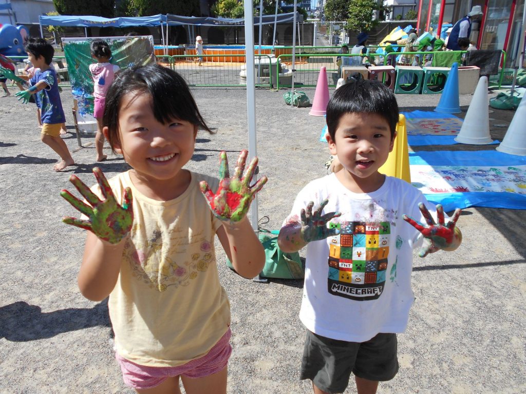 大きな紙に手をペタペタしたり、自分や友達、先生の体や服にも「ペタッ!ペタッ!」とたくさん付け、笑顔がはじけていました😊