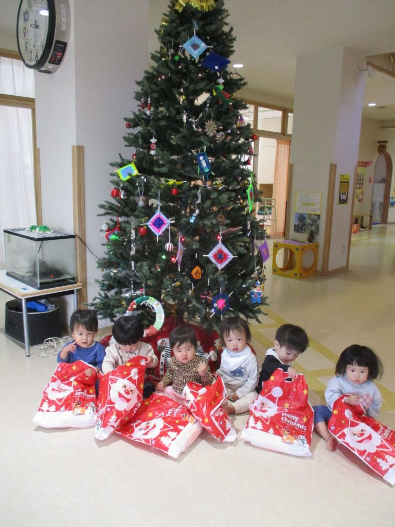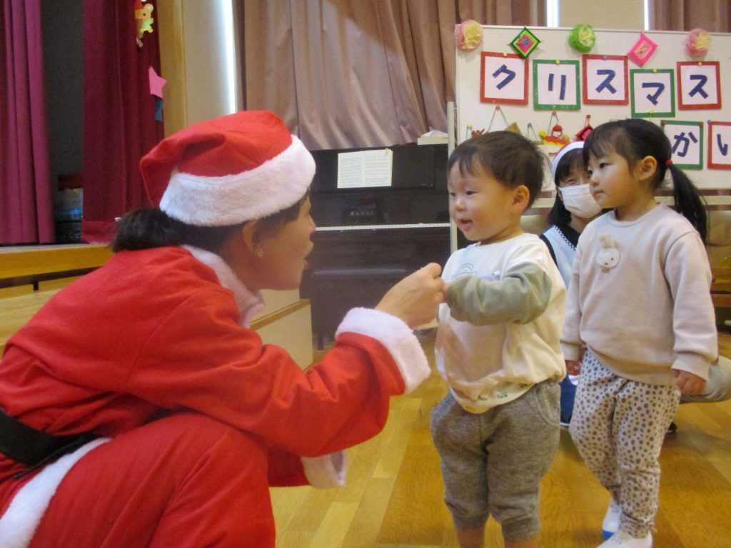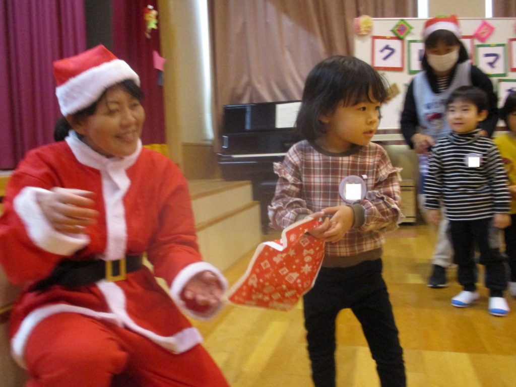 今日は楽しみにしていたクリスマス会でした。園長先生がサンタさんからお手紙を頂き、忙しいサンタの代わりに皆にプレゼントを渡してほしい・・・ということでサンタさんに変身してプレゼントを持って来てくれました。1人1人プレゼントを手渡しされるととても嬉しそうにジーっとみている子どもたち。心のこもったプレゼントですのでお家で大切に使ってくださいね。