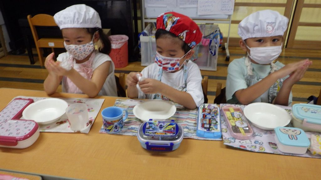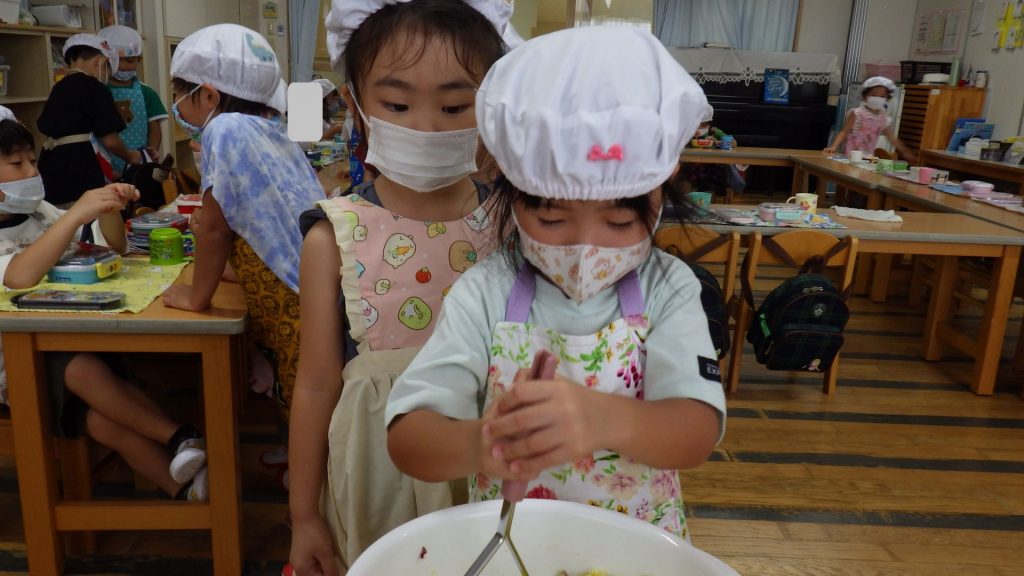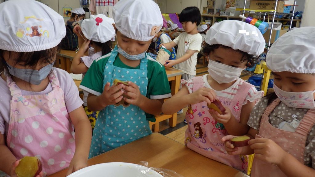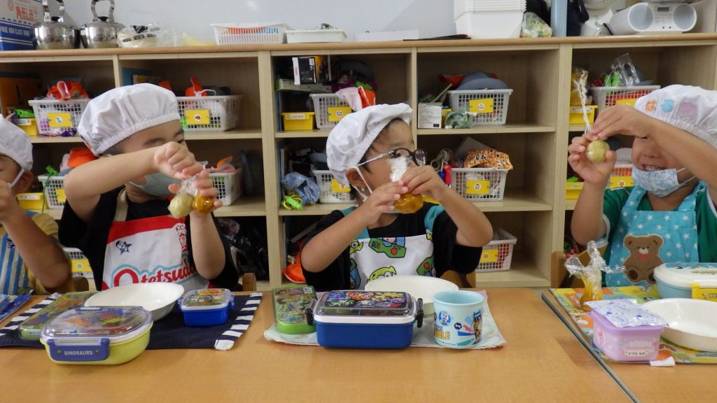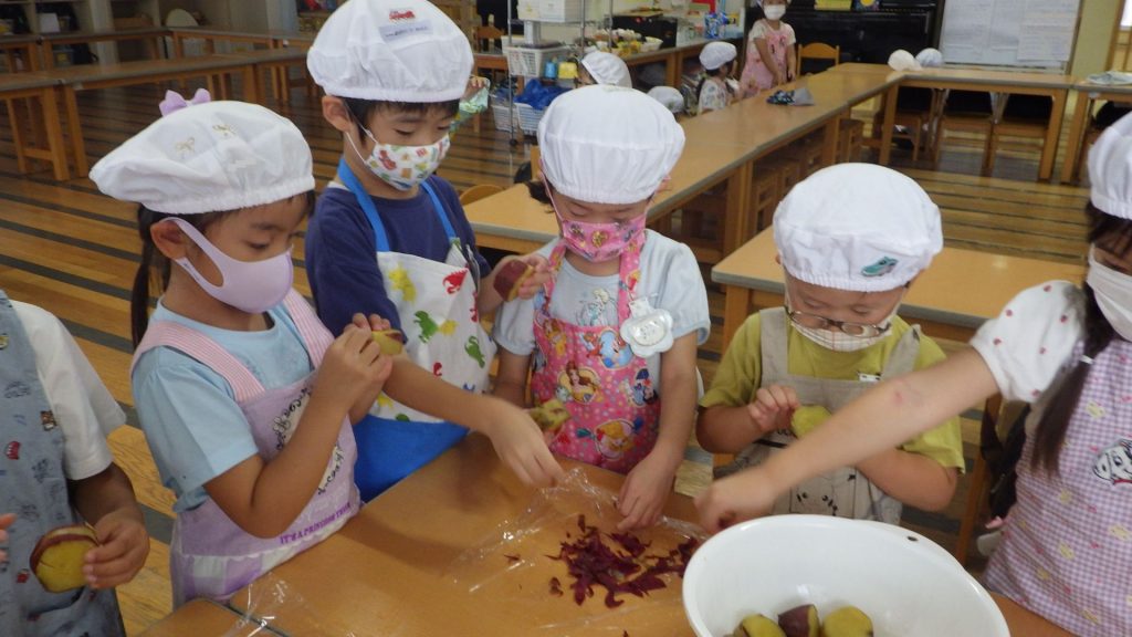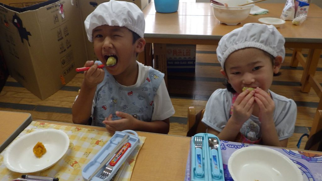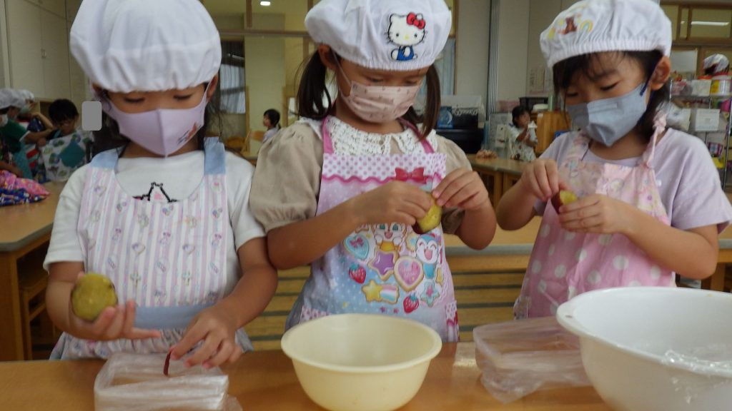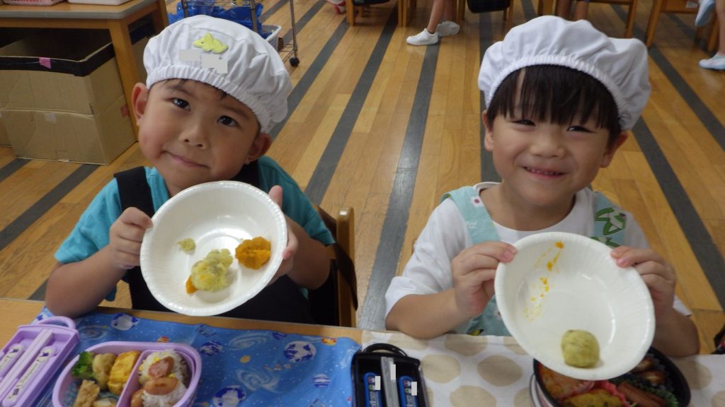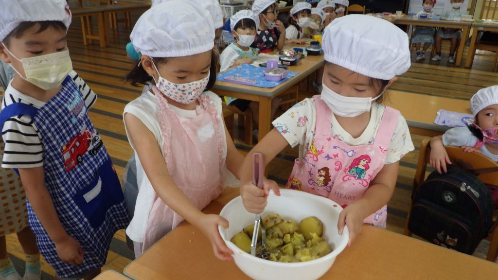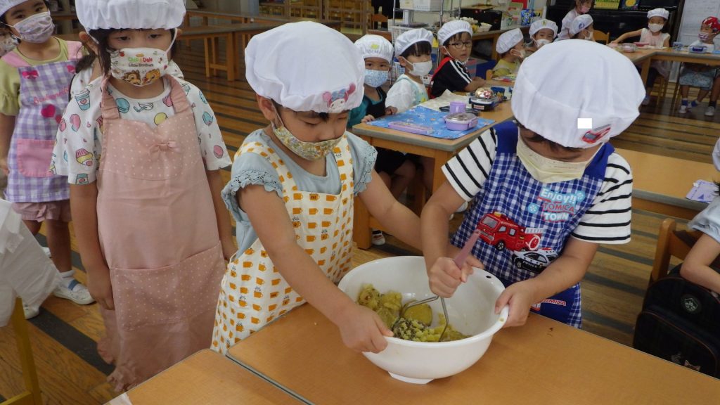 「あったかい!」「さっきよりも柔らかくなってる!」「甘い匂いがするよ!」「つぶすのに力がいるね!」と五感で素材の変化にふれることができました!