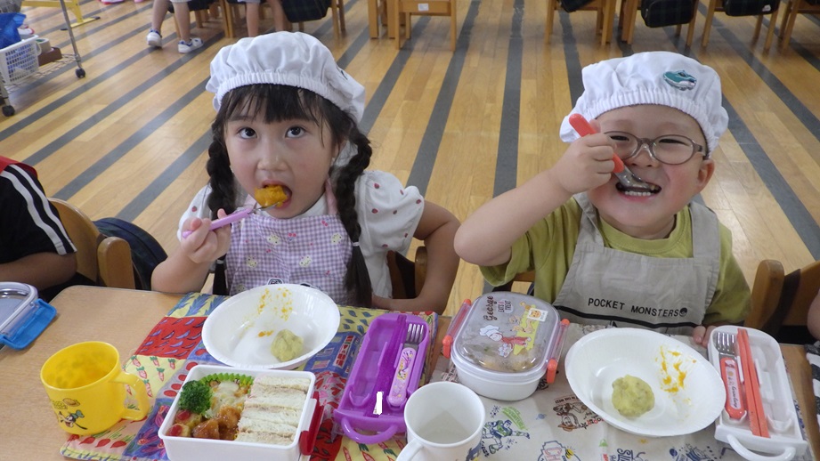 「あったかい!」「さっきよりも柔らかくなってる!」「甘い匂いがするよ!」「つぶすのに力がいるね!」と五感で素材の変化にふれることができました!