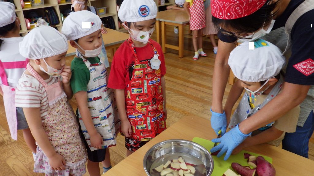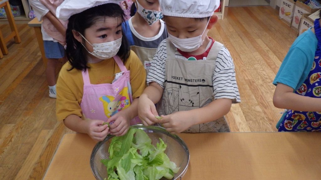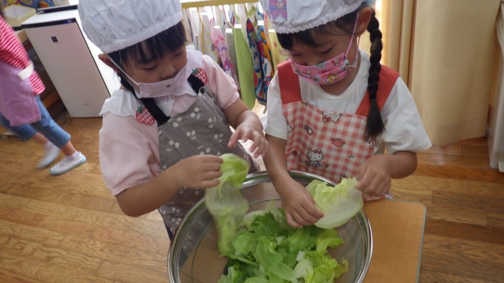 味噌汁の具も準備はレタスをちぎったりサツマイモを切ったり…