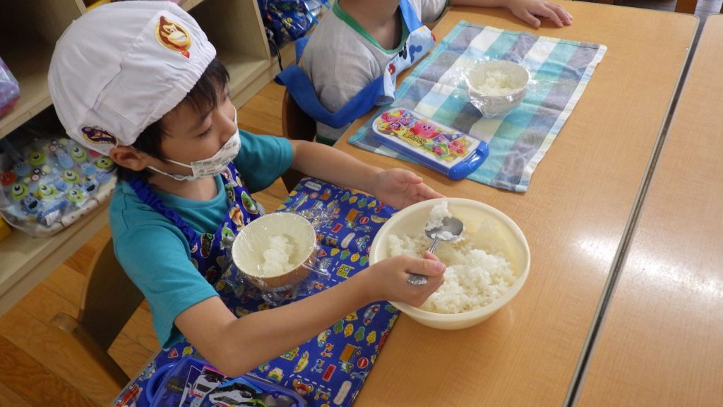 少し冷ましたご飯を自分でラップによそっておむすび作りスタート🍙