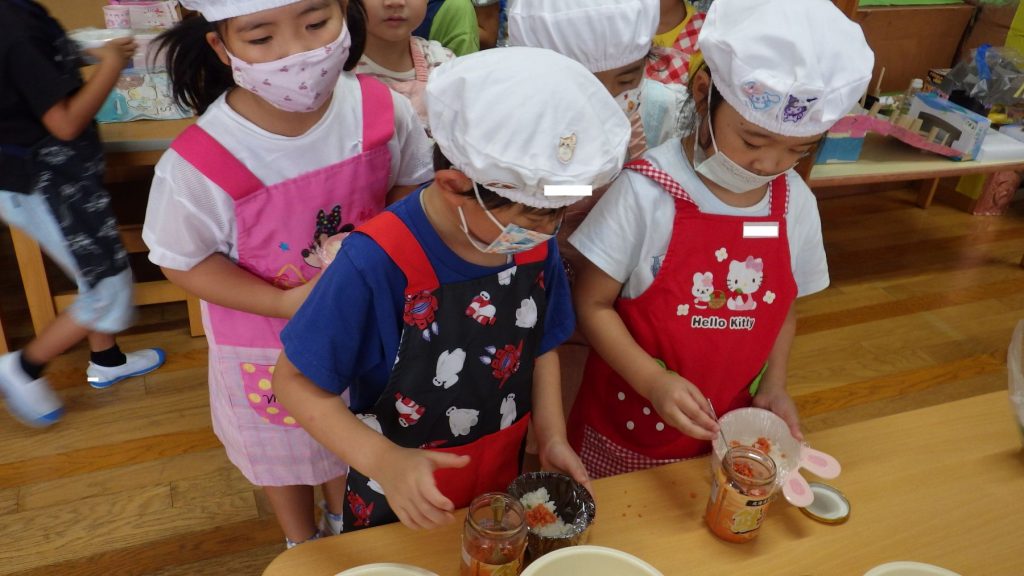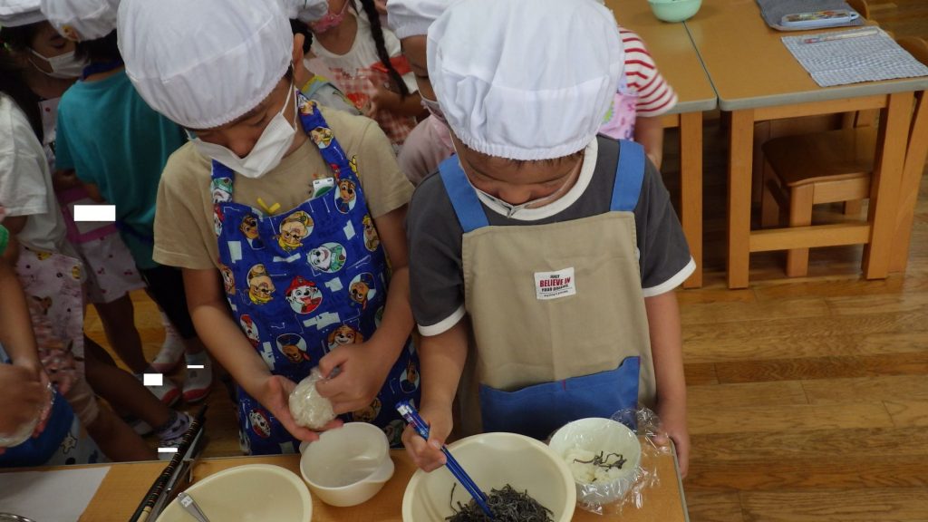 具を選んで入れて…「何にしようかな」「昆布!」「鮭がすき💕」