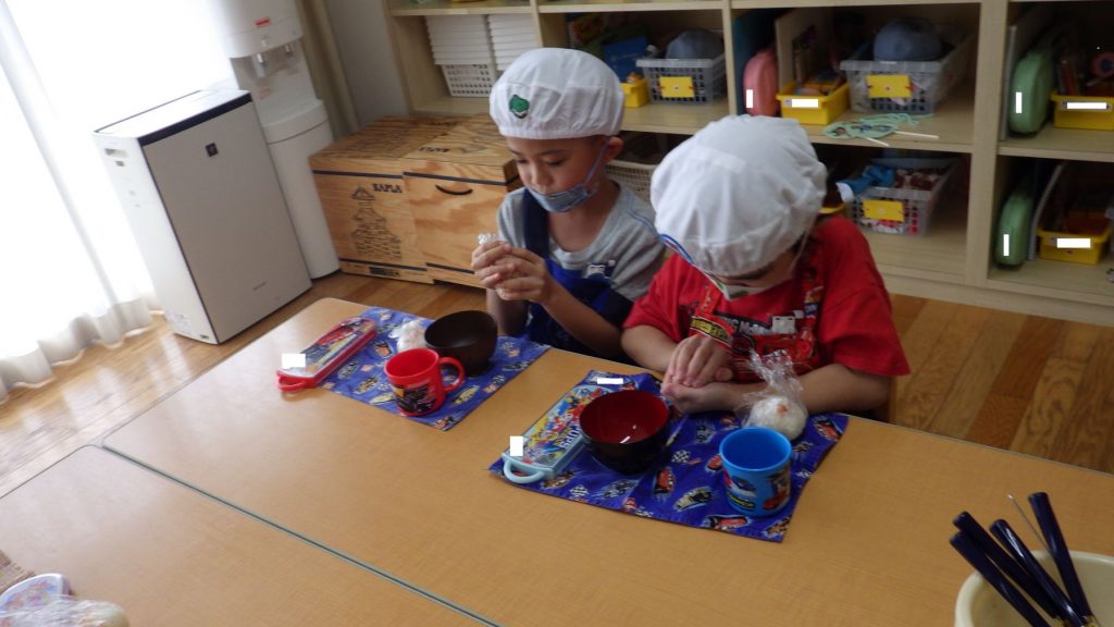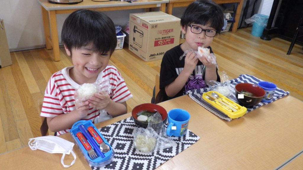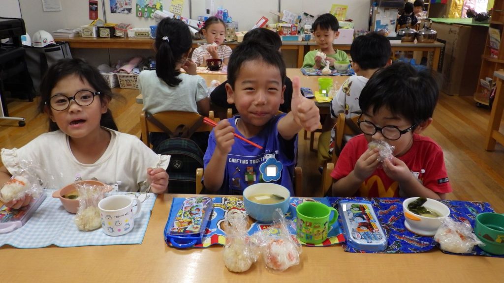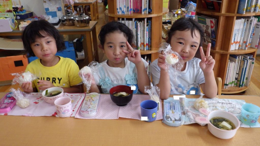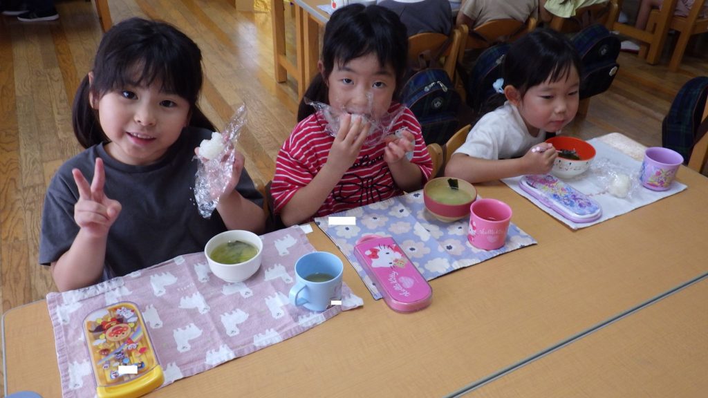 ゆり組は…鮭、醬油むすび。  味噌汁はサツマイモ、コーン、わかめ、豆腐です。