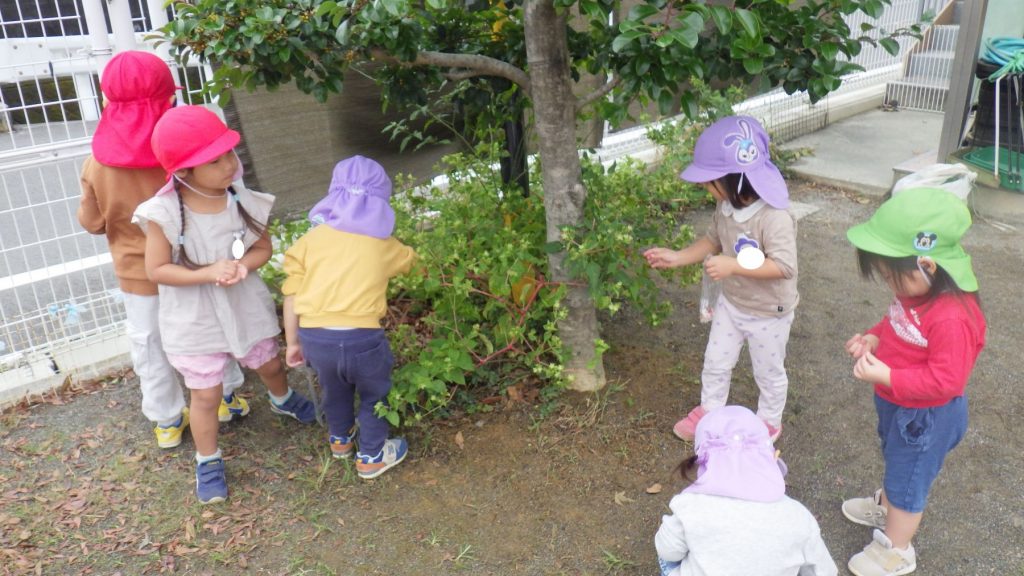 戸外では、おしろい花の実を探したり、花をつぶしたり袋に水を入れてニギニギして色水遊びを楽しんでいます。