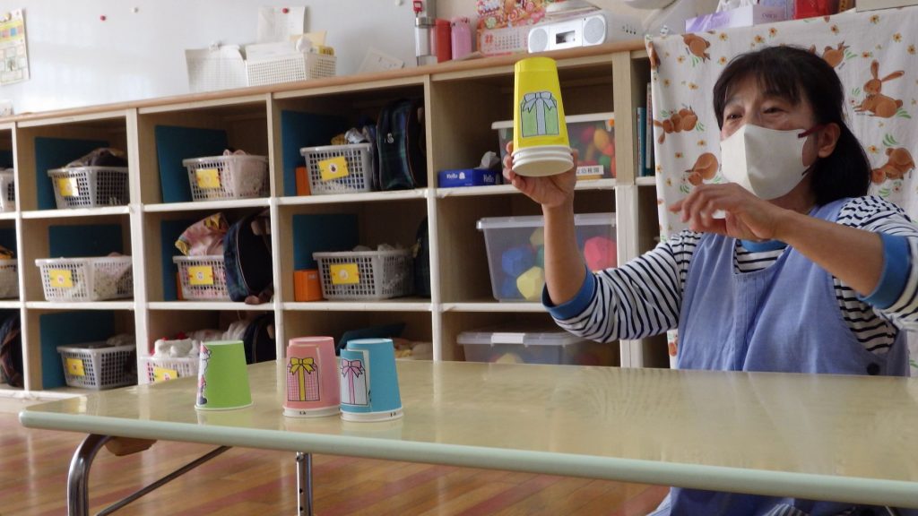 楽しい仕掛けのある紙コップでお話が始まり、「プレゼントは何かな?」とみんなわくわくしながら見ていました。
