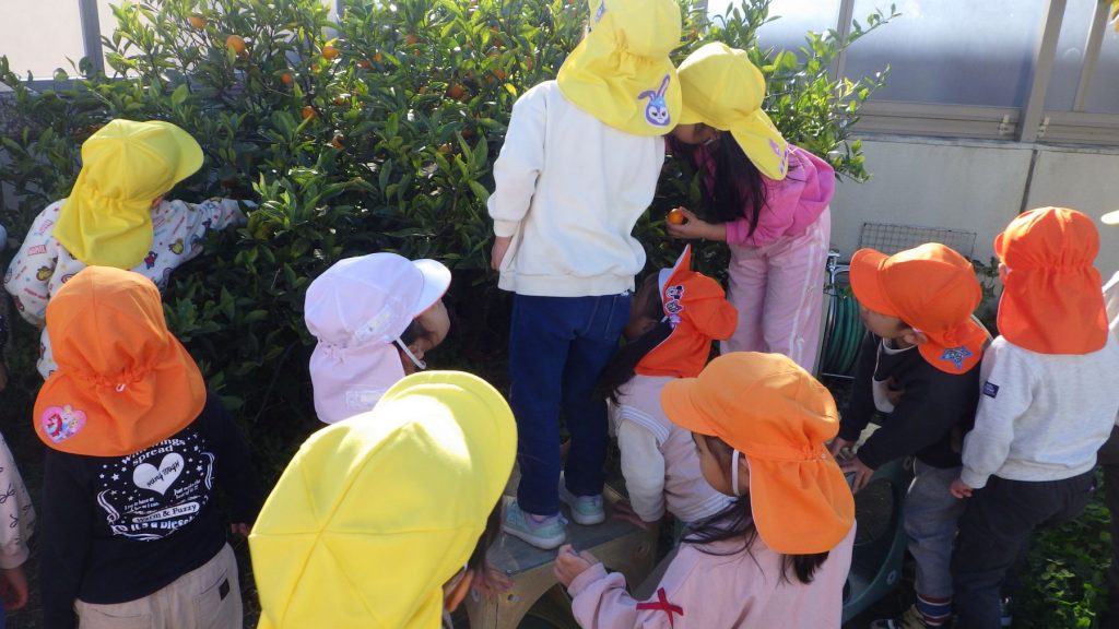 「みかんを持ってくるくる回すんだよ!」「順番で採る!」など子どもたちなりに友達とかかわりあいながら工夫して収穫を楽しみました💓