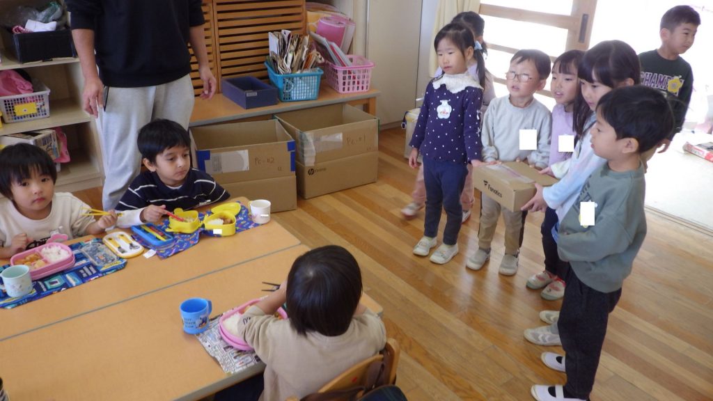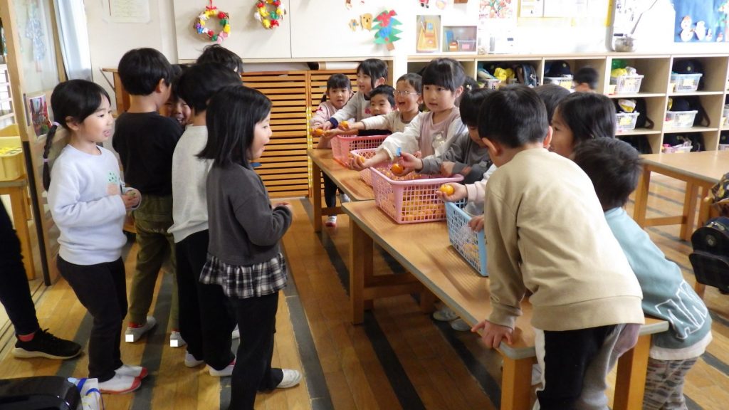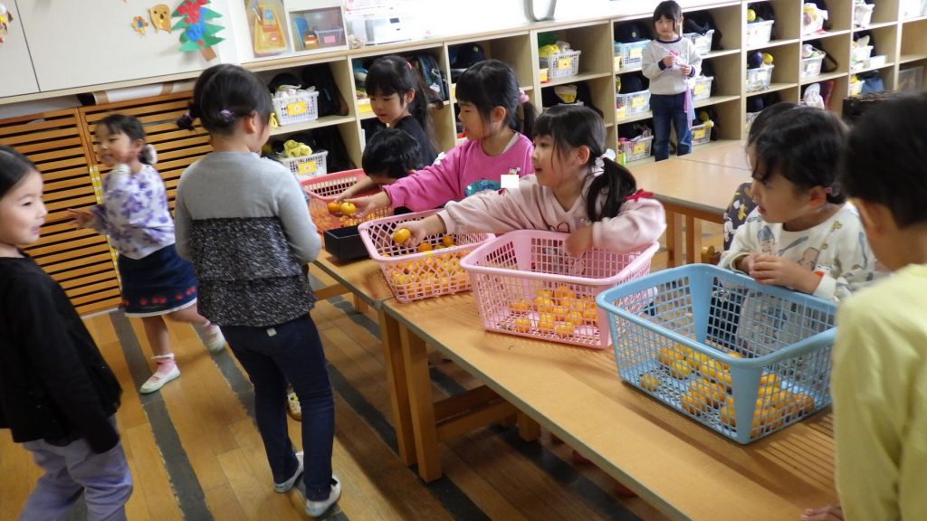 「これならたちばな幼稚園のお友達は217人だから、みんなにみかんを配れるね!!」と、各クラスの人数分のみかんをグループのみんなでもう一度数え、みかんを届けに行きました!!