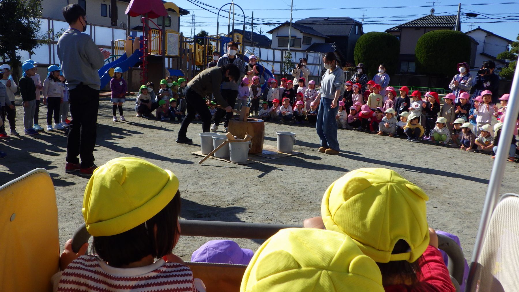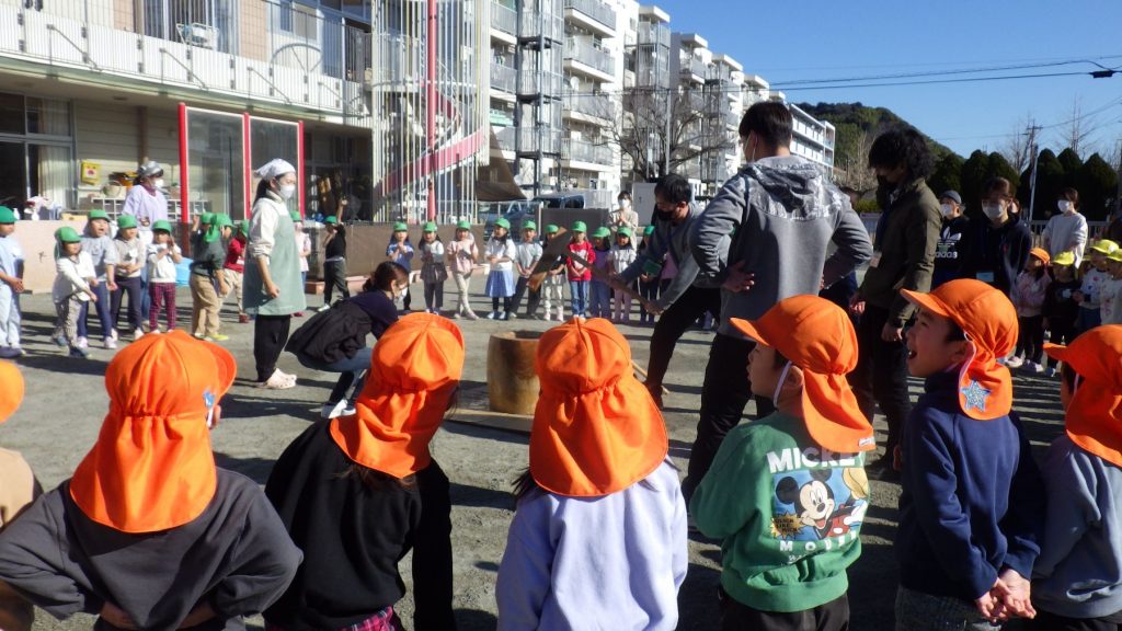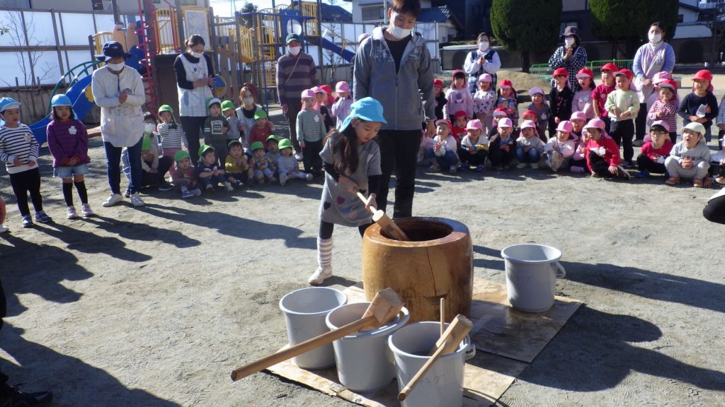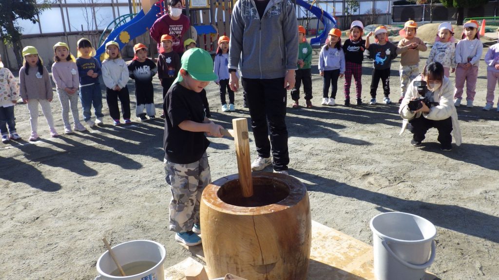 手伝いの保護者の方と年長さんがおもちつきをしてくれました🌟