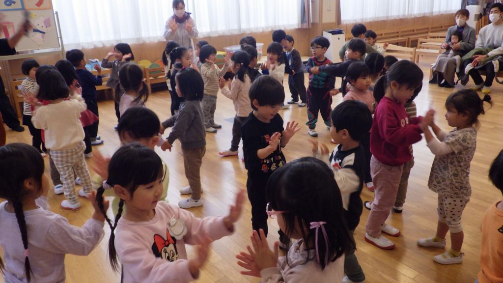 3歳児は“”たきび”の歌に合わせてふれあい遊び、4、5歳児はラーメン体操を楽しみました🌟