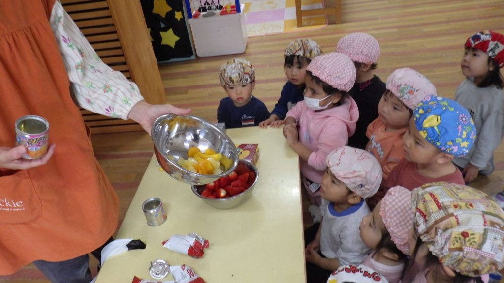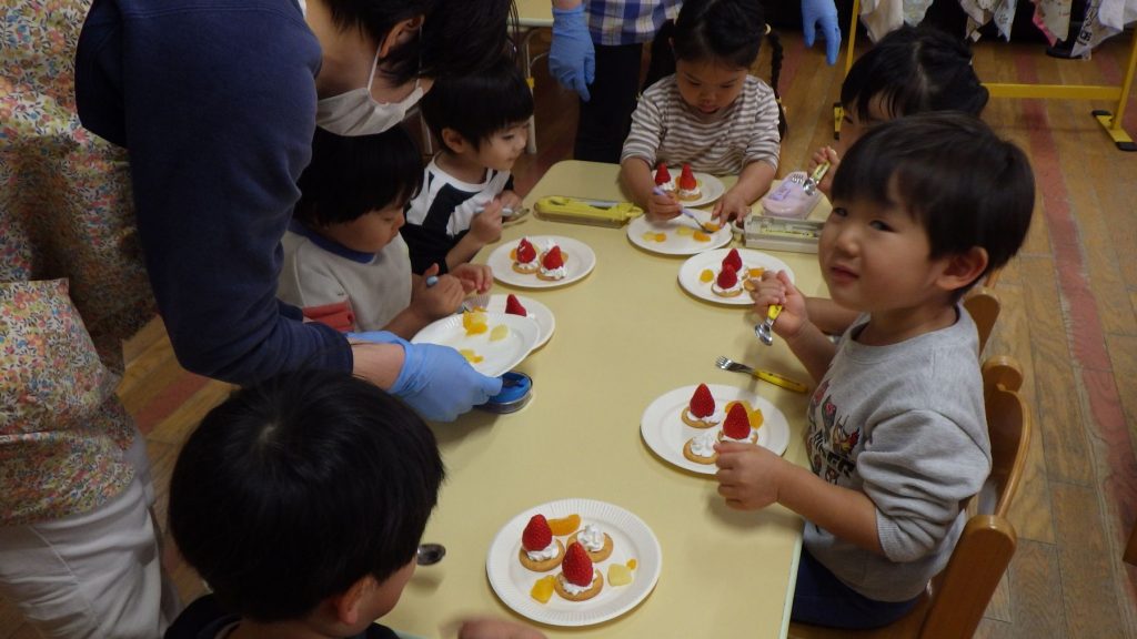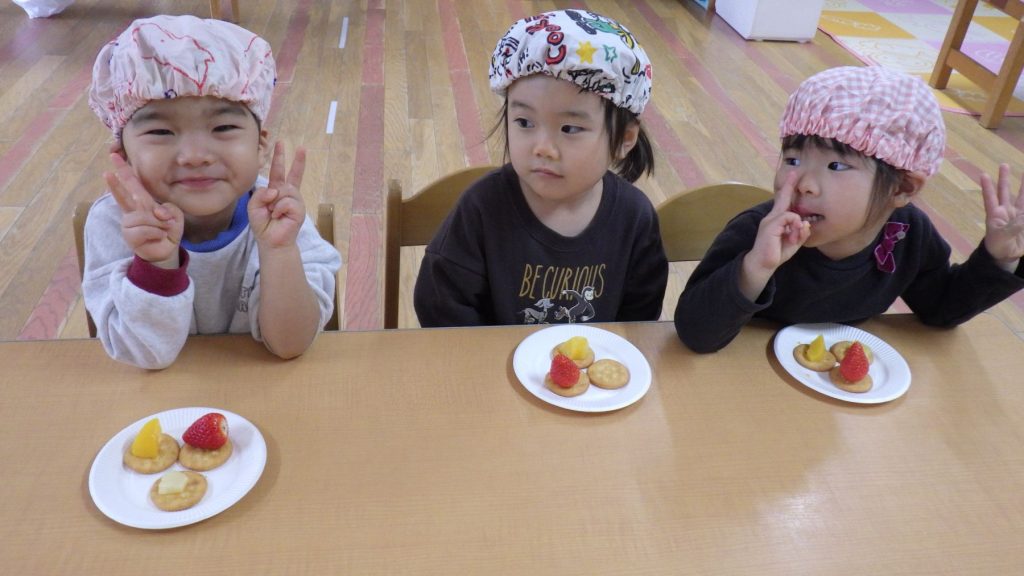 今日は待ちに待ったクッキング!!リッツの上に果物や生クリームを自分でデコレーションし、お皿に盛り付けして完成🎵